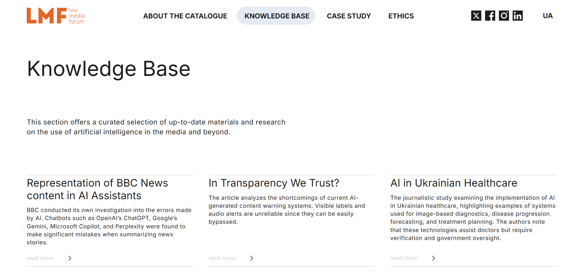 The platform also features additional resources to support the responsible and effective use of AI. The Knowledge Base offers a curated selection of up-to-date materials and research on the use of artificial intelligence in media and beyond. The Case Studies section brings together real-life examples of how AI tools are used in Ukrainian and international newsrooms. The Ethics section presents key ethical protocols, guidelines, and rules for AI use developed by governmental and educational institutions, think tanks, and technology companies.