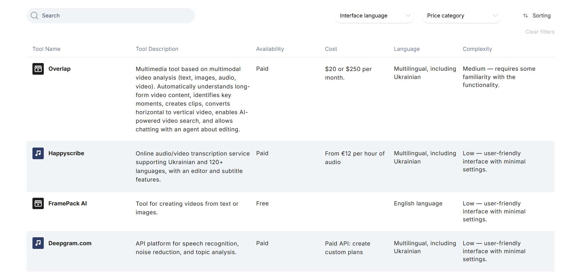 Tools can be filtered by interface language (multilingual with or without Ukrainian, Ukrainian-only, or English-only) and by pricing model (free, freemium, or paid). Each tool description also includes information about its level of complexity and ease of use.