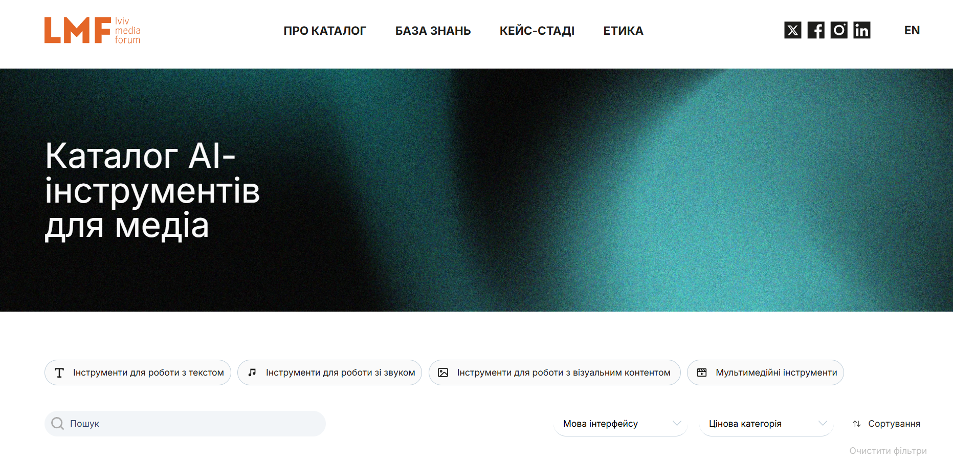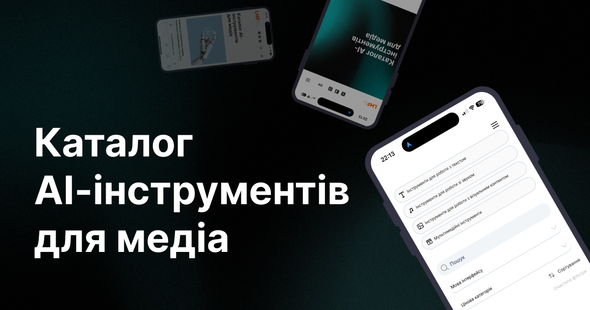 Команда дослідницького відділу Львівського медіафоруму зібрала понад 150 АІ-інструментів і розробила каталог із ними та матеріалами про їхнє використання. Він доступний для використання та має зручну навігацію. Інструменти штучного інтелекту в каталозі згруповані в чотири кластери: