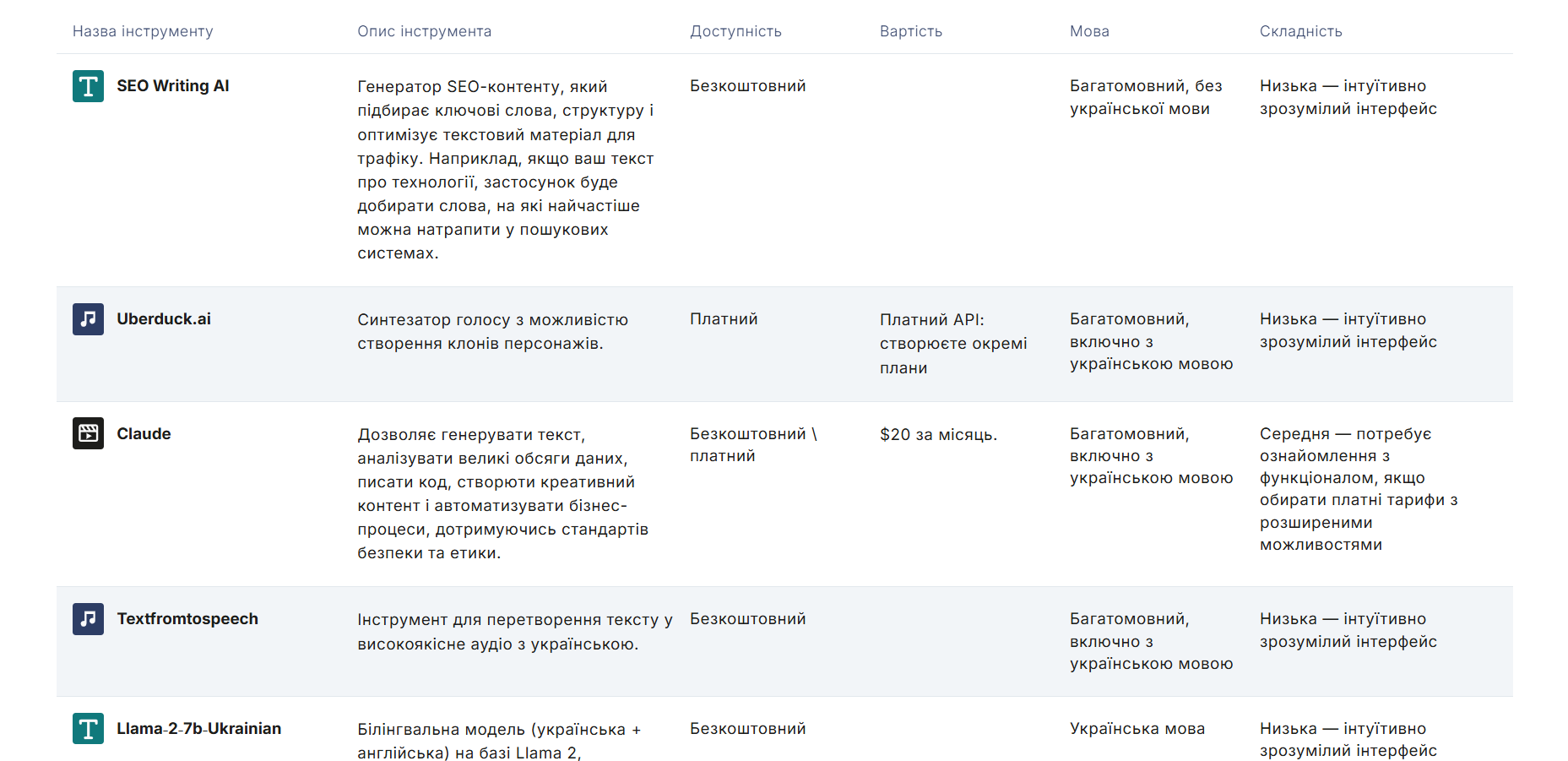 Інструменти можна відсортувати за мовою інтерфейсу (багатомовний із/без української, лише українська або лише англійська) та ціновою категорією (безкоштовні, безкоштовні з платними функціями, платні). Окрім цього, в описі кожного інструмента є інформація про його складність у використанні.